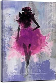 キャンバス壁アート セクシー ブラック ガール パープル 塔の街の風景 レディ モダン ニューヨーク市 アートワーク、ピンクガール エレガント エンパイア 建物 絵画 プリント フレーム オフィス 寝室 バスルーム ホームデコレーション - 24インチ x 36インチ 1パネル