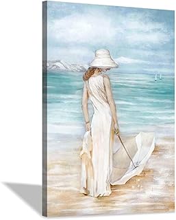 抽象的なビーチ&ガールアートワークの絵:青い海の風景の絵画 海岸壁アート リビングルーム用 (24インチ x 36インチ x 1パネル)