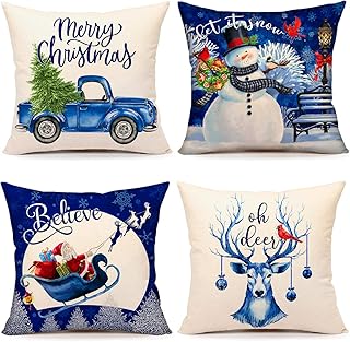 4TH Emotion ブルー クリスマス 枕カバー 18x18 4枚セット 農家 クリスマス デコレーション メリークリスマス トラック サンタ そり スノーマン 鹿 冬 ホリデー デコレーション スロー クッション ケース ホーム カウチ TH049