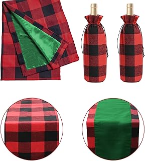 PIXHOTUL バッファロー プレイド クリスマス テーブル デコレーション 14x108インチ リバーシブル コットン バッファロー チェッカード テーブル ランナー と 2ピース レッド ブラック プレイド ワイン ボトル バッグ ホリデー クリスマス パーティー 用品 L サイズ A